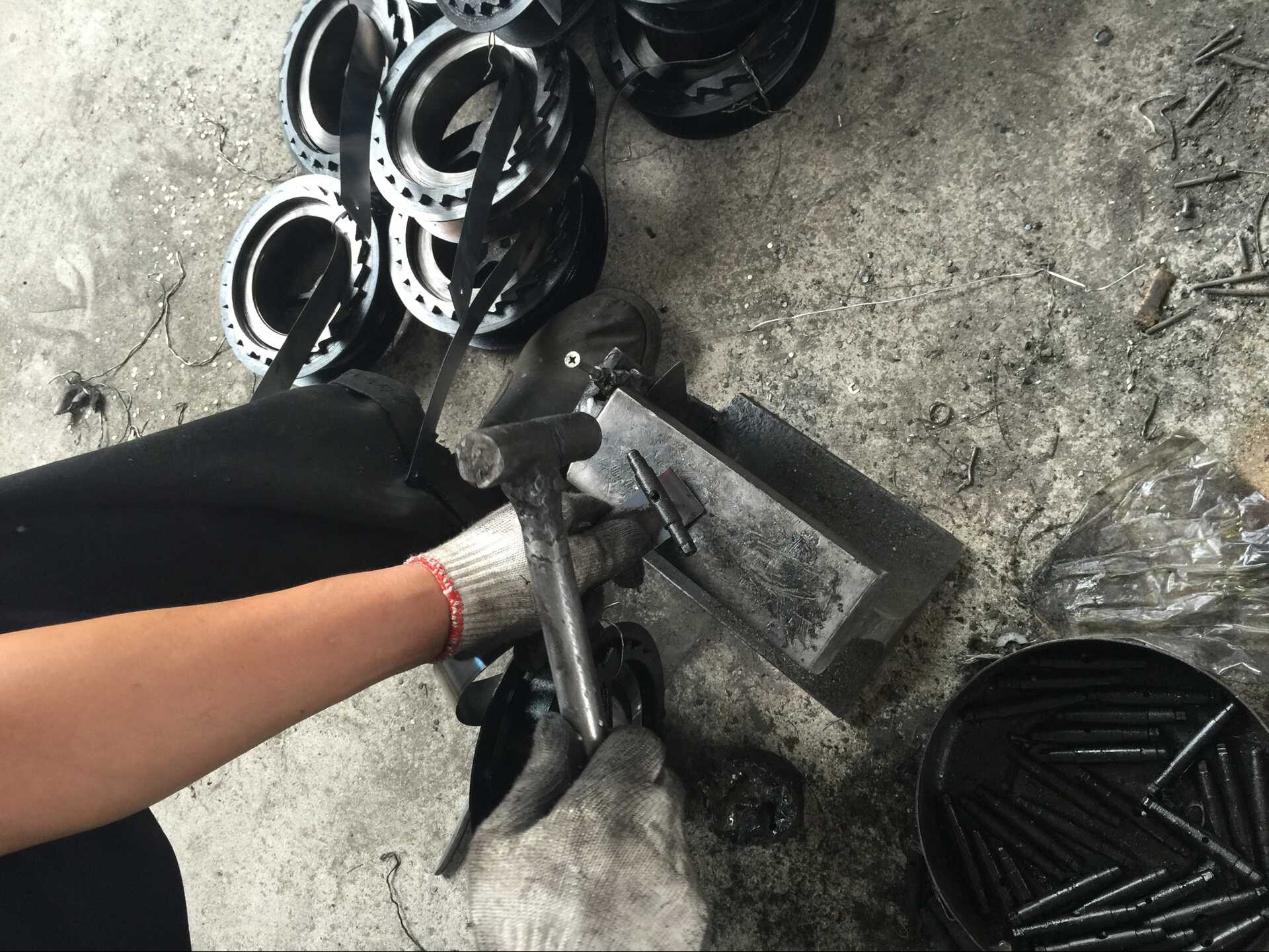 查看詳情防墜器卷鋼板的末端在固定這個止銷之前是經(jīng)過高溫?zé)频?,以方便對鋼板進(jìn)行加工。止銷安裝在防墜器齒輪的中間孔內(nèi),主要起到固定卷尺鋼板的作用。此圖片展示的是將止銷先固定在鋼板彈簧上,師傅正在敲打螺絲釘將其固定在直銷中間的位置內(nèi),師傅左手握的那一截鋼板是經(jīng)過燒制以后的,所以質(zhì)地較軟,方便彎曲也方便用螺絲釘固
