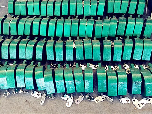 圖片展示的是得東圣高空防墜器修整完畢,準(zhǔn)備批量上漆烘烤。綠色外殼的機(jī)械便是我們的防墜器烘烤箱。防墜器外殼是掛在圖片左側(cè)一排掛鉤上,開動(dòng)機(jī)器以后傳動(dòng)帶會(huì)帶動(dòng)防墜器移動(dòng)到烤箱內(nèi),先是機(jī)械噴漆,使得噴漆面積均勻,然后便是烘烤過程。防墜器外殼烘烤時(shí)間20分鐘為佳。